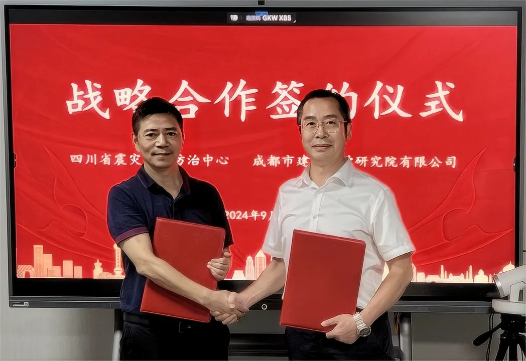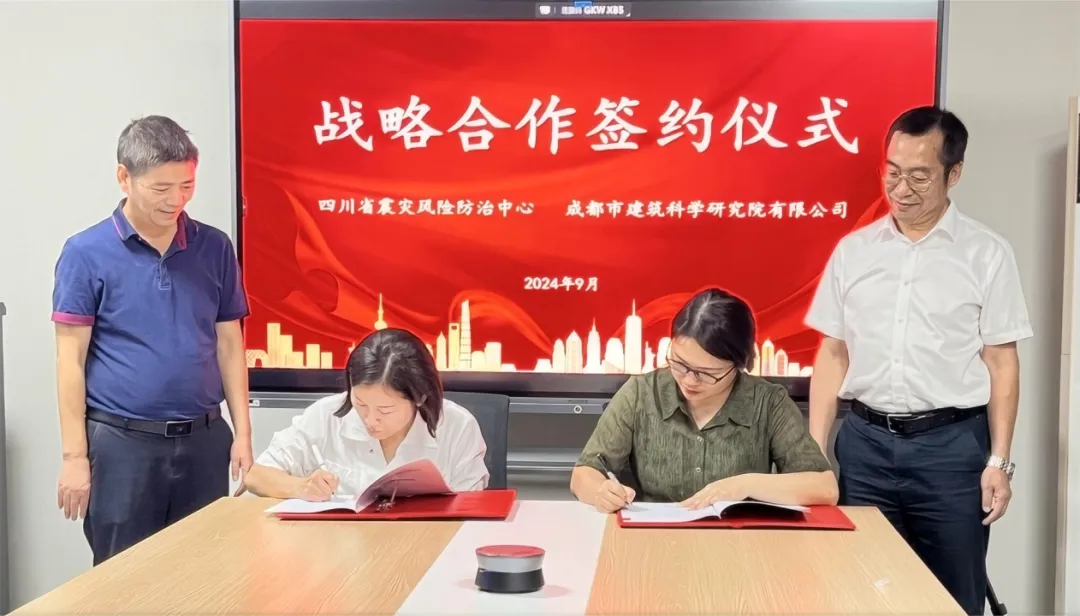 9 月 27 日,由市建科院党总支书记、执行董事、总经理罗国康,党总支委员、技术总监吴波率队赴四川省震灾风险防治中心(以下简称“省灾防中心”)签订战略合作协议。灾防中心主任戴仕贵与副主任梁明剑参加签约仪式。