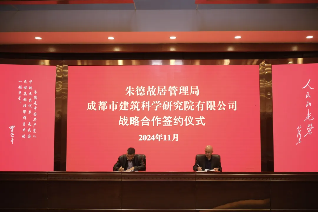 11 月 7 日,朱德故居管理局与成都市建筑科学研究院有限公司(以下简称:市建科院)召开战略合作签约仪式,朱德故居管理局党组书记、局长赵亮,市建科院党总支副书记、副总经理、工会主席罗康代表双方签署战略合作协议。