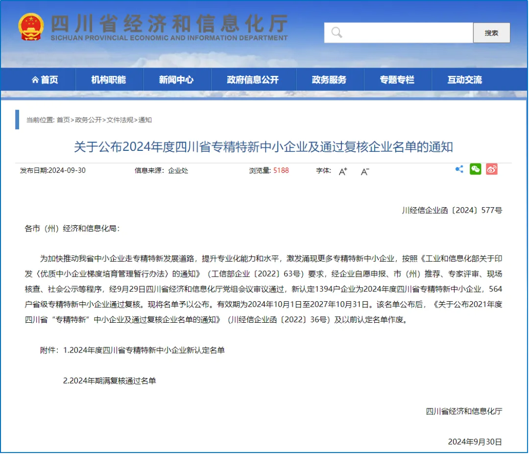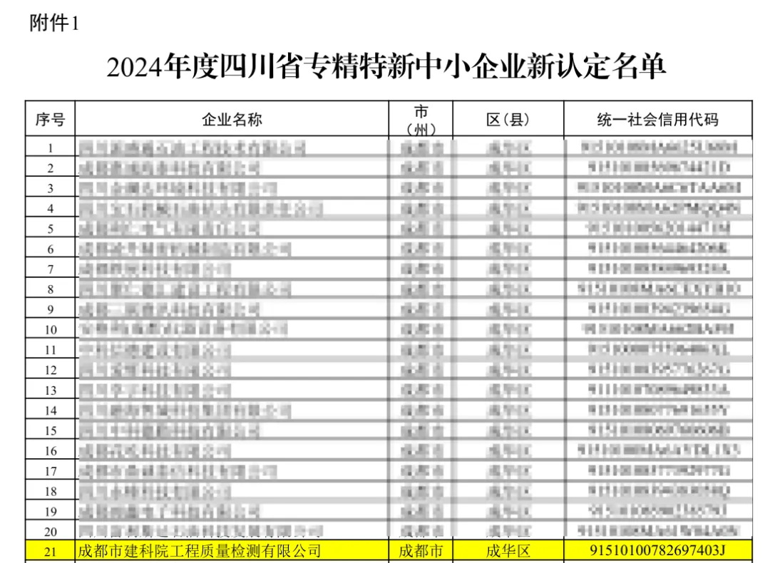 近日,四川省经济和信息化厅发布了《关于公布2024年度四川省专精特新中小企业及通过复核企业名单的通知》,正式认定成都市建科院下属成都市建科院工程质量检测有限公司为四川省专精特新中小企业。
