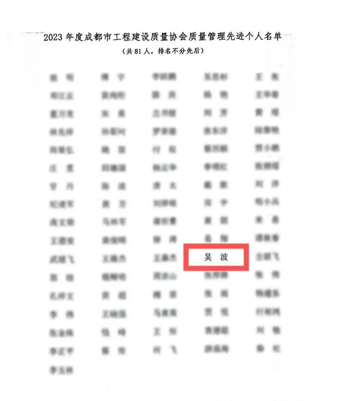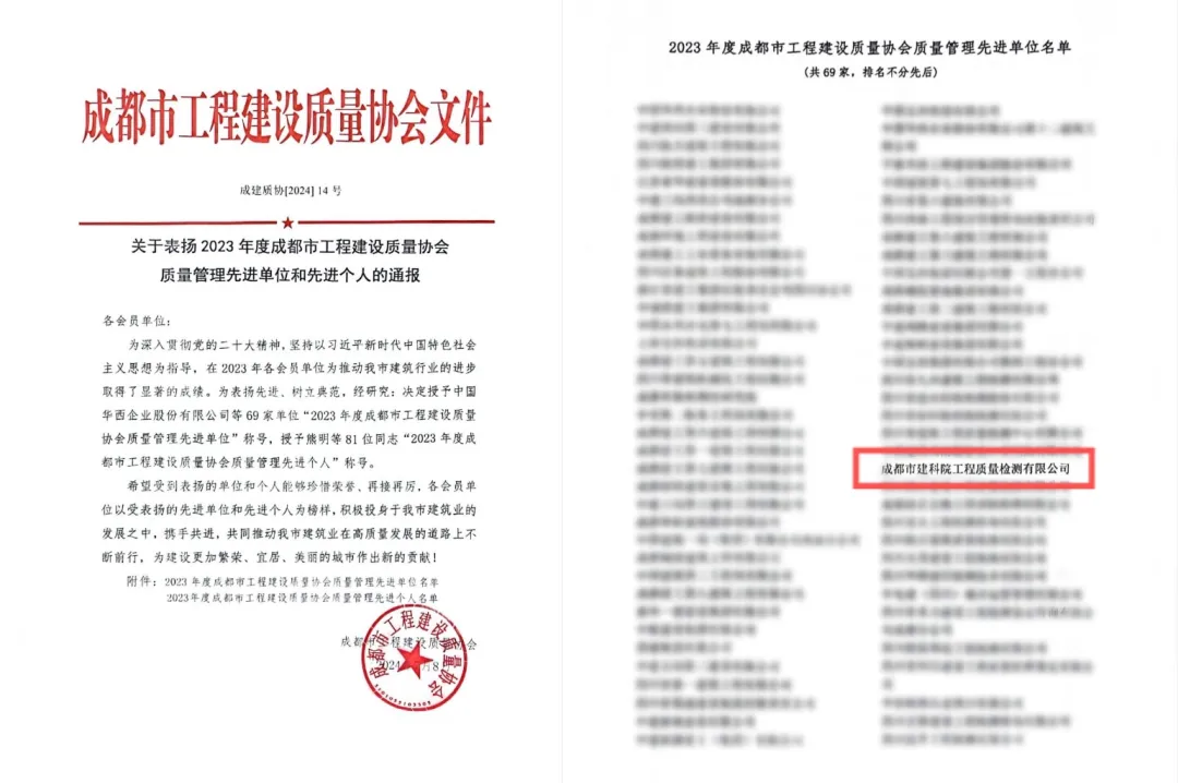 近日,根据《成建质协[2024]14号——关于表扬 2023 年度成都市工程建设质量协会质量管理先进单位和先进个人的通报》文件,市建科院检测公司荣获“2023年度成都市工程建设质量协会质量管理先进单位”,公司法人吴波同志亦被授予“2023年度成都市工程建设质量协会质量管理先进个人”的荣誉称号。
