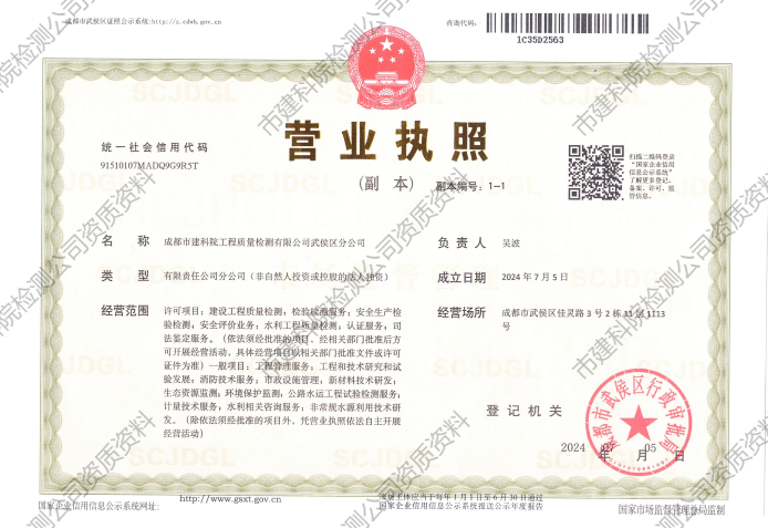武侯区作为成都市的一个重要区域,拥有丰富的文化底蕴和极具发展潜力的经济环境,市建科院检测公司选择在此设立分公司,正是抓住了这一区域的发展机遇,预示着市建科院将更好地服务于地方建设,推动城市建设向着更加科学、绿色、可持续的方向发展。同时,武侯区分公司将成为市建科院对外展示其技术实力的重要窗口,有助于提升其品牌影响力和市场竞争力。