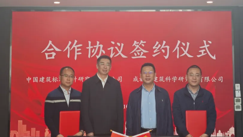 近日,市建科院与中国建筑标准设计研究院有限公司(以下简称“中国标准院”)举行合作协议签约仪式,并进行座谈会。成都设计咨询集团副总经理徐军、中国标准院副总经理高鹏出席并参加座谈,市建科院技术总监吴波、中国标准院认证部主任张大伟代表各方签约。