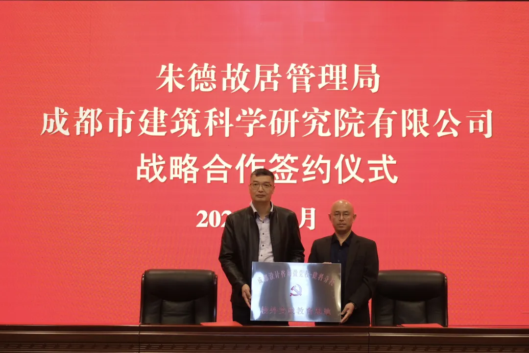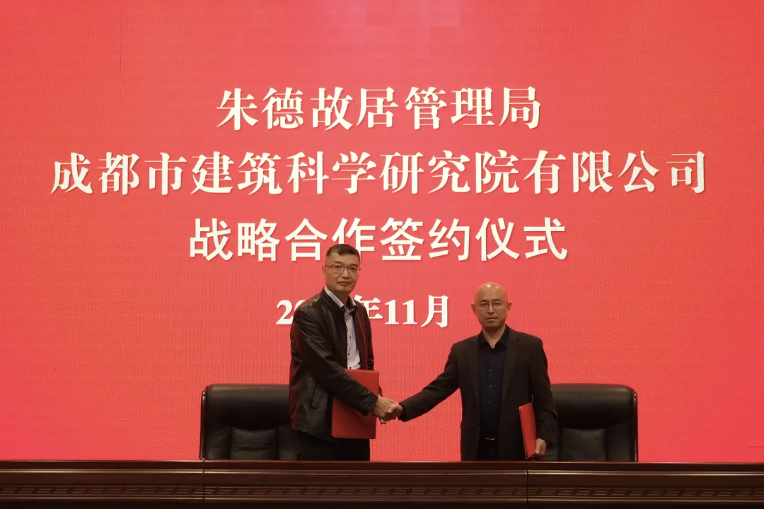 11 月 7 日,朱德故居管理局与成都市建筑科学研究院有限公司(以下简称:市建科院)召开战略合作签约仪式,朱德故居管理局党组书记、局长赵亮,市建科院党总支副书记、副总经理、工会主席罗康代表双方签署战略合作协议。