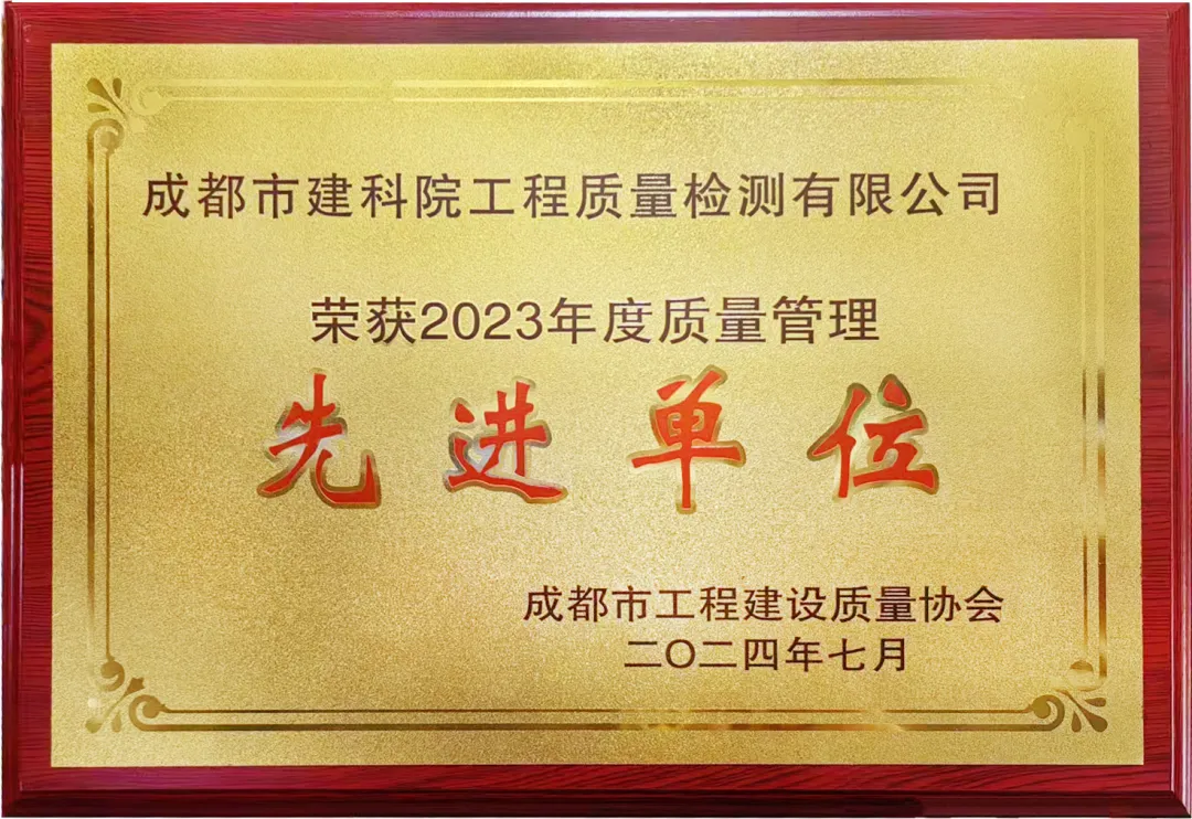 近日,根据《成建质协[2024]14号——关于表扬 2023 年度成都市工程建设质量协会质量管理先进单位和先进个人的通报》文件,市建科院检测公司荣获“2023年度成都市工程建设质量协会质量管理先进单位”,公司法人吴波同志亦被授予“2023年度成都市工程建设质量协会质量管理先进个人”的荣誉称号。