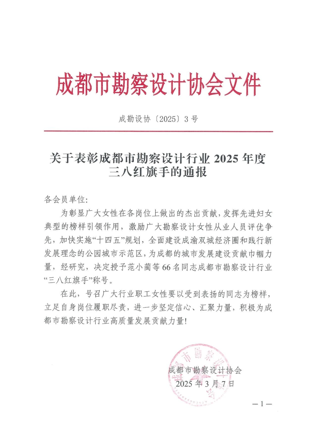 为彰显勘察设计行业广大女性在各岗位上做出的杰出贡献,近日成都市勘察设计协会组织开展2025年度“三八红旗手”评选活动。